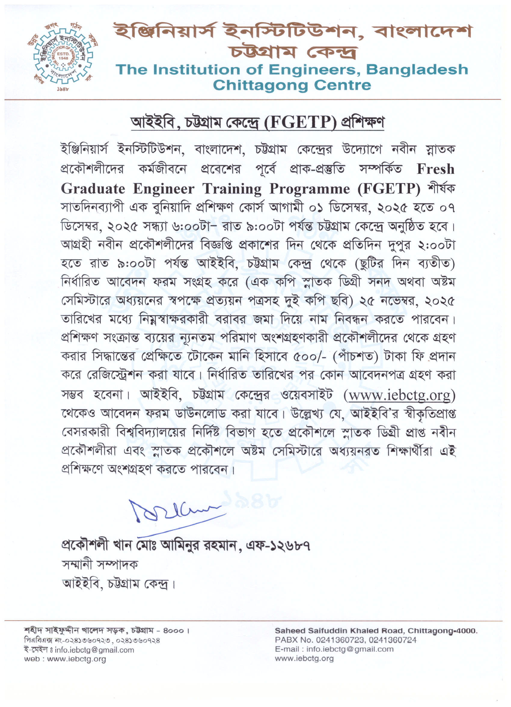 The Institution of Engineers Bangladesh(IEB), Chittagong Center is the most prestigious National Professional Organization of the country. It is registered under the Societies Registration Act of the country. IEB includes all disciplines of engineering. Currently, it has in its roll more than 5,000 engineers with about 30% in the category of Fellows, 60% Members and the rest as Associate Members.